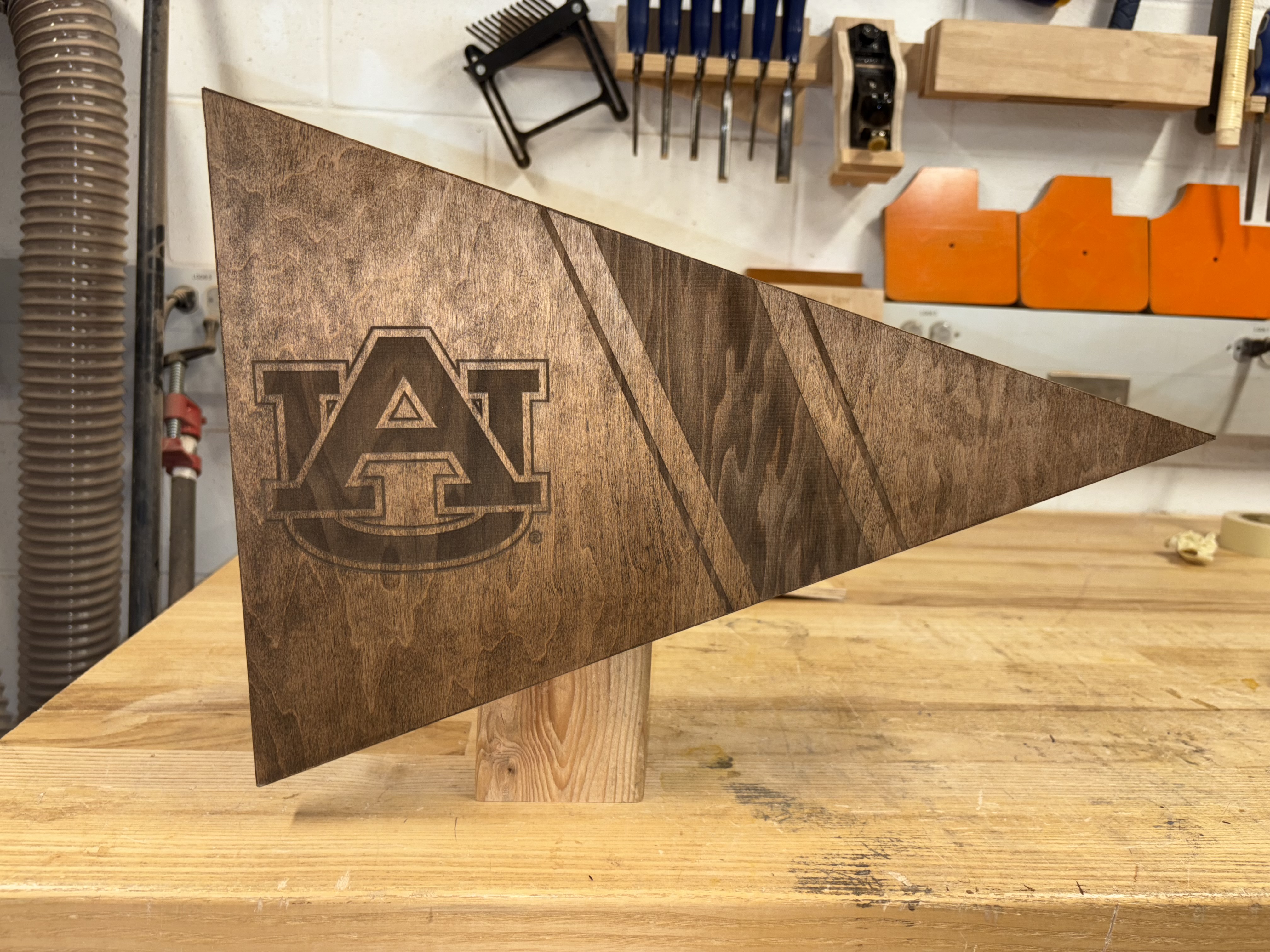 A decorative wooden Auburn Sailing Burgee (triangular flag for sailing).