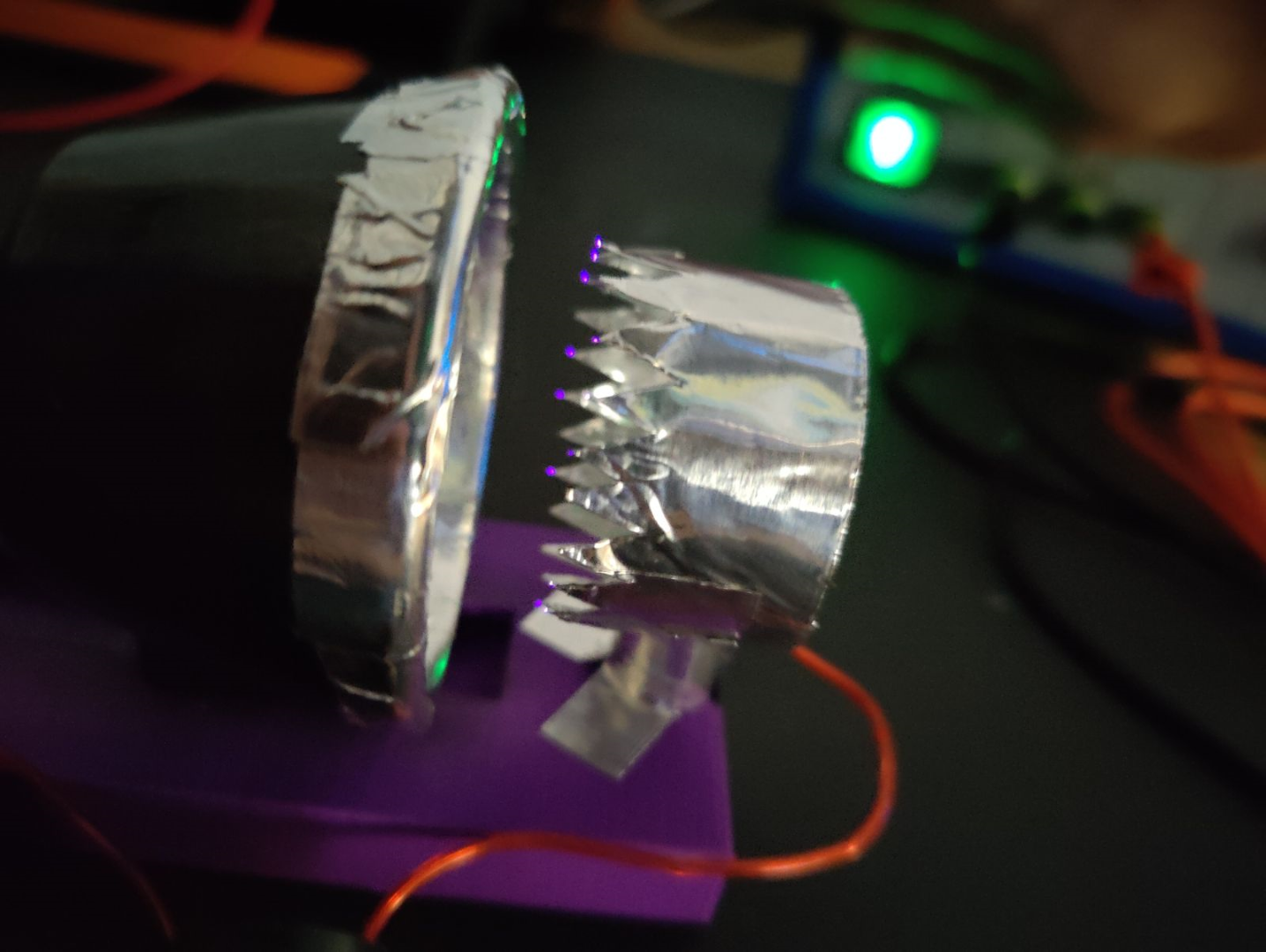 Made from 3D printed parts including PLA and resin printed pieces, aluminum tape, a switch, and a step-up voltage generator used in stun guns to generate a high voltage. The Ion thruster passes this high voltage through a small ring of aluminum tape with spikes facing the resin-printed nozzle that is covered in aluminum tape for conductivity. The distance between the spikey ring and the nozzle is adjustable by sliding the nozzle on the built-in track. The ion thruster works by ionizing the air and as the voltage jumps through the air passing to the nozzle it drags air molecules along for the ride, generating thrust through the center of the thruster. The attached video is this ion thruster with a voltage of 1.5 volts passing through it.